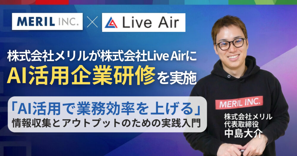 株式会社メリルの代表取締役中島大介が、株式会社LiveAir様向けに企業研修「AI活用で業務効率を上げる」を実施いたしました。