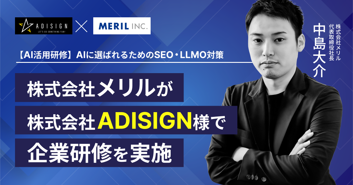 株式会社メリルの代表取締役中島大介が、株式会社アディザイン様向けに、企業研修「AIに選ばれるためのSEO・LLMO対策」を実施いたしました。
