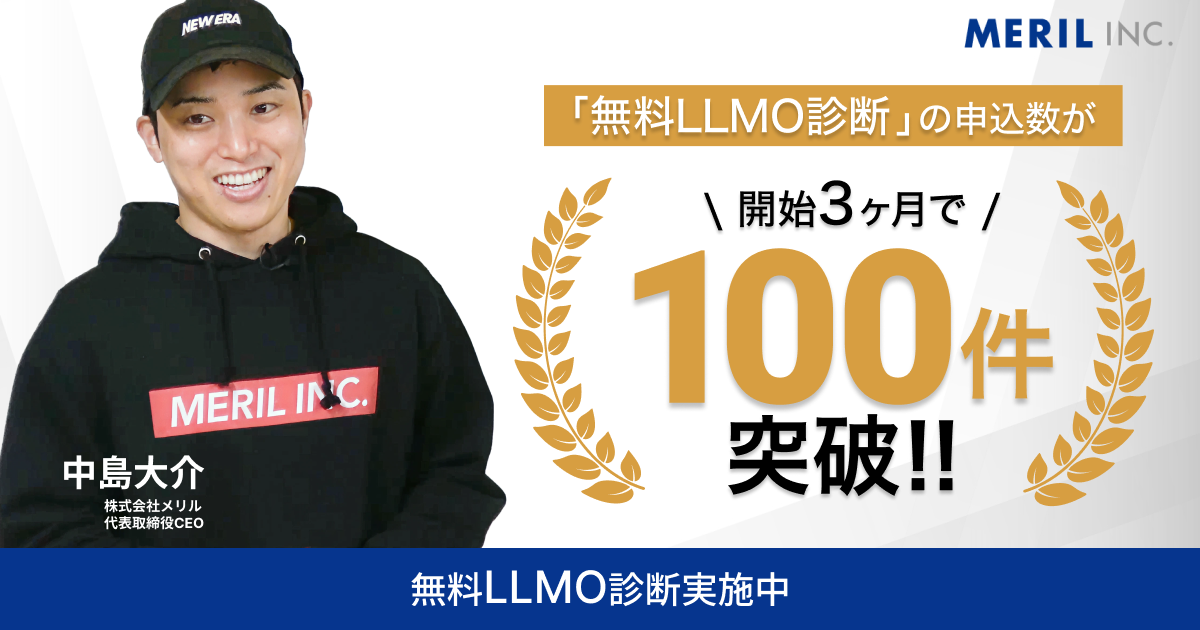 株式会社メリルは、法人向けに提供している無料LLMO診断サービスについて、サービス提供開始から3ヶ月で申し込み数が100件を突破したことをお知らせいたします。